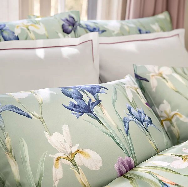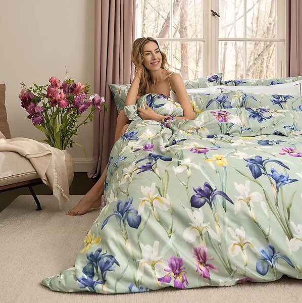 The Schlossberg Charlotte Vert Bedding captures the magic of a field in full bloom. Its enchanting design invites you to wander through a meadow of irises, their delicate petals painted in velvety midnight blue, soft violet, golden yellow, and ivory. The rich watercolor tones sway gently against a sage green background, creating depth and movement with every glance. Each floral silhouette leans toward the next, echoing nature's quiet rhythm and surrounding your space with artistic serenity. Special order, usually ships in 4-8 weeks.