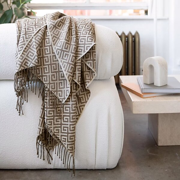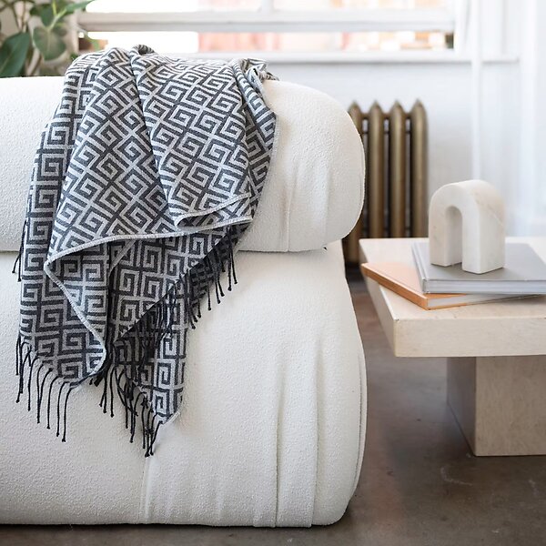 The St Genève Bruno Throw is where classic artistry meets contemporary sophistication. Crafted from 100% baby alpaca, it features a labyrinthine Greek key motif, symbolizing unity and harmony. This geometric pattern flows seamlessly across the surface, balancing intricate precision with soft, fluid drape. Available in two elegant hues-Almond and Charcoal-each throw is accented by a contrasting outline that enhances the pattern's refined symmetry. Whether layered over a sofa, chair, or bed, Bruno introduces a touch of quiet luxury to any interior.