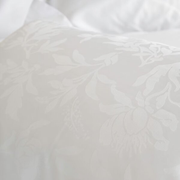 The St Genève Giza 92 Flora collection captures the art of understated luxury. Its tone-on-tone floral jacquard pattern reveals peonies, leafy sprigs, and delicate stems that softly emerge from the luminous white background through texture, not color. This botanical motif flows gracefully across the fabric, creating gentle movement and a serene visual rhythm. With its subtle sheen and fluid drape, this collection embodies a quiet, classic elegance that elevates any bedroom with effortless refinement. Made to order in Canada, usually ships in 4-6 weeks.
